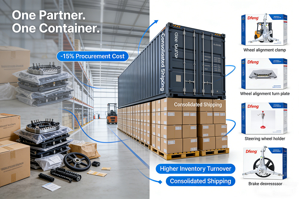 바로 그때 Dfeng이 완벽한 액세서리 통합 솔루션을 선보였습니다. 우리는 휠 얼라인먼트 클램프, 얼라인먼트 턴 플레이트, 스티어링 휠 홀더, 브레이크 누름기 등 모든 것을 한 지붕 아래로 가져오는 원스톱 조달 패키지를 제공했습니다. 모두 동일한 높은 표준에 따라 설계되었으며 모두 통합된 브랜드 지원 스타일로 포장되어 통합 컨테이너에 함께 배송되었습니다.